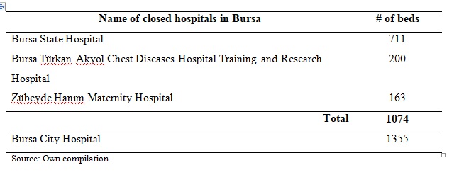 Tables below indicate bed numbers in opened city hospitals and closed state hospitals in two cities, namely Ankara and Bursa. After Bilkent City hospital with 3810 bed capacity had come into service in Ankara, six state hospitals with 3415 beds were liquidated. The same thing has happened in Bursa. The City Hospital with1355 bed capacity has replaced three hospitals with 1074 beds. City hospitals in these two cities have created just 676 new beds (i.e. 15 percent of former bed number).